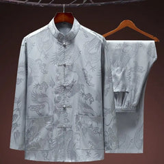 Hot Sale New Chinese Traditiona Men Silk Satin Kung Fu Suit Tang Suit Sets Long Sleeve Jacket Pants Dragon Wu Shu Tai Chi Sets
